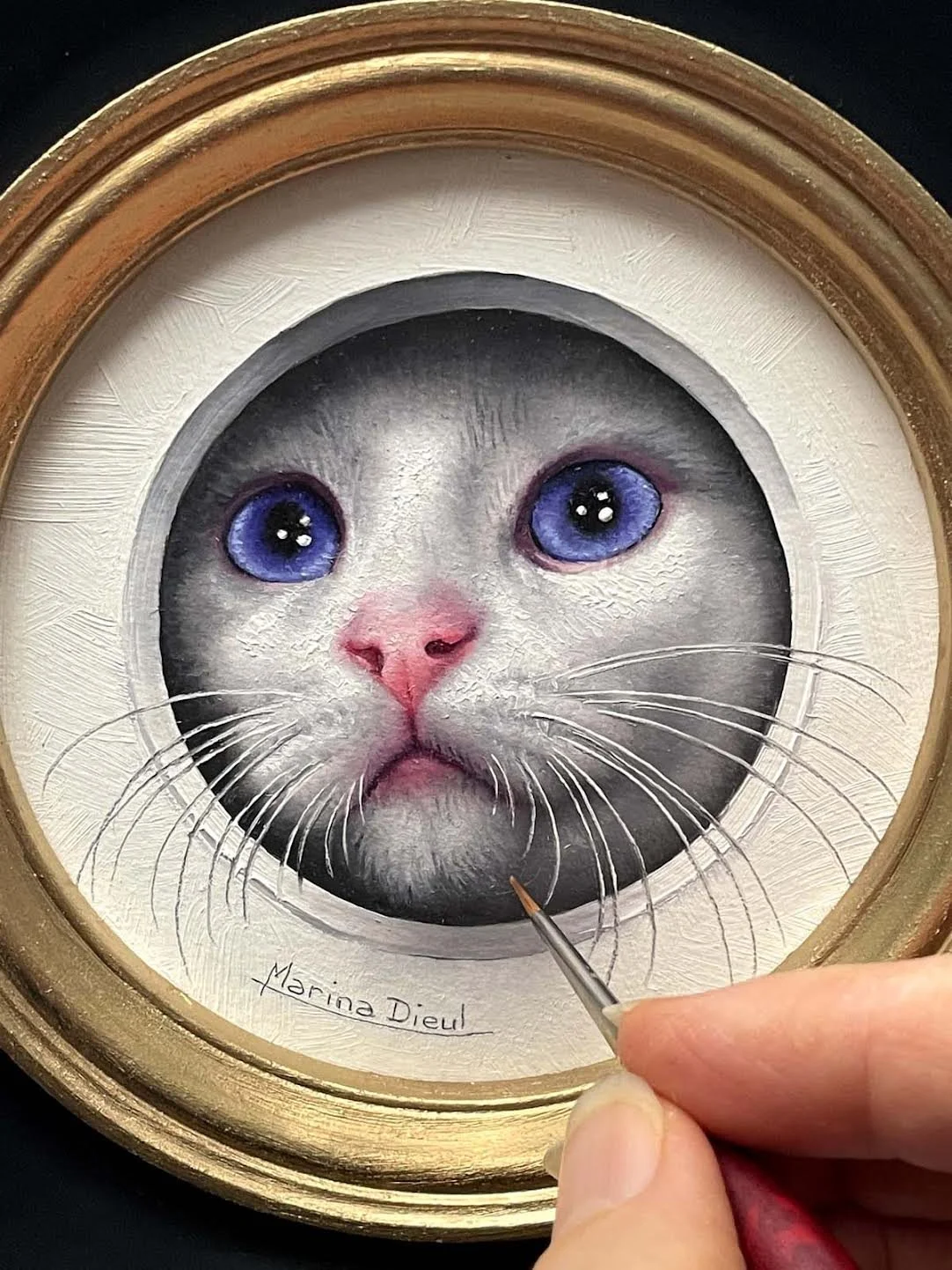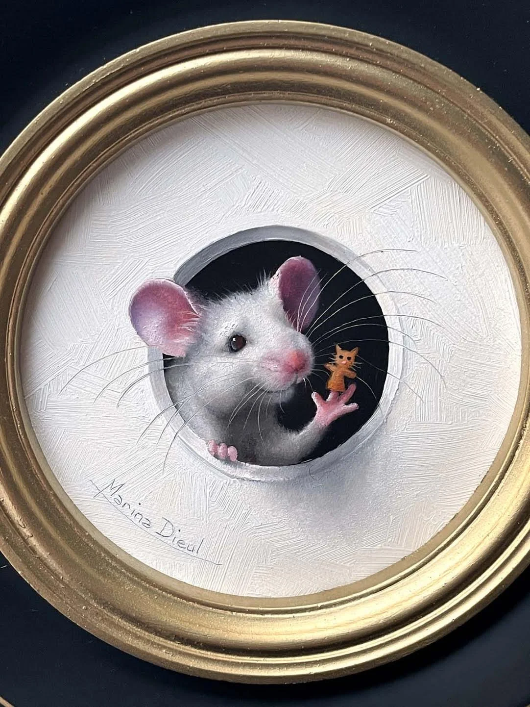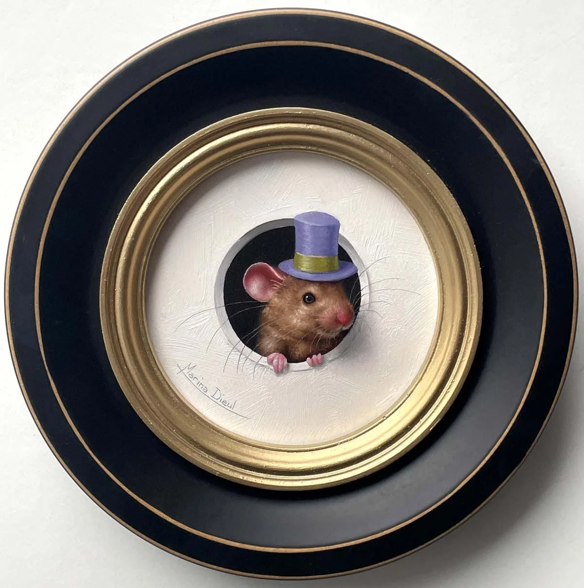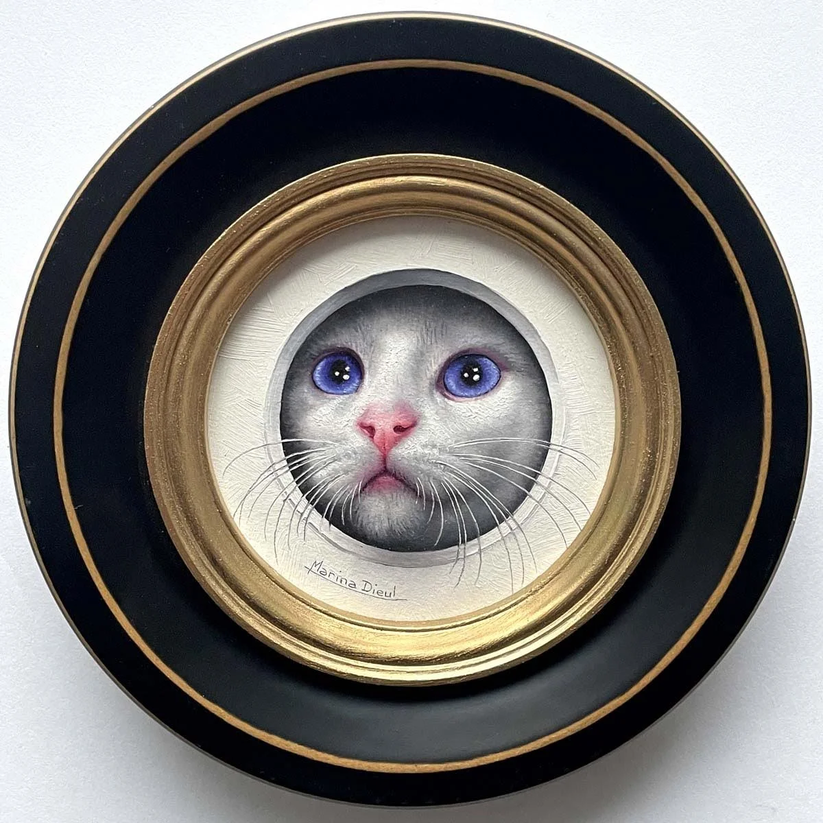 Marina Dieul is known for her animals and figures paintings in trompe-l'oeil style, full of humor and poetry. She works in her Montreal studio surrounded by the many cats she fosters for a no-kill shelter in Montreal. Past and current memberships include the Portrait Society of Canada, the Portrait Society of America, Cecilia Beaux Forum ( PSoA), the International Guild of Realism and Mondial Art Academia.